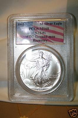 So I made a post recently about the MS68 and MS69 1993 WTC silver eagle that it is a very rare coin with only about 120 coins in its population found at the WTC. Well I am starting to see people on E-bay calling the 1993 Gem Uncirculated coin very rare, and as most of you know following E-bay auctions on these coins know, that is not the case. The WTC 1993 Gem Uncirculated coins is very often up on E-bay going for anywhere between $70 to $140. Well after my posting I am seeing the 1993 Gem Uncirculated coin show up with buy it now of $230. The 1993 Gem Uncirculated coin is not any more rare than the 2001 Gem Uncirculated $1 silver coin from the World trade center. Just to make that clear to everybody. So people saying that the 1993 Gem Uncirculated is 10 times more rare than the 2001 WTC Gem Uncirculated does not know what they are talking about.