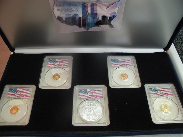 Just came across this picture on the web, a great looking set with 4 WTC $5 gold coins and a $1 silver eagle, looks great in the show case box. Well look closer its the 1998, 1999, 2000, 2001 WTC $5 Gold Coins and a 2001 $1 WTC Silver eagle looks great and I think the 2000 WTC $5 gold coins is very very scares with only 17 coins believed to have been found at ground zero. Looking at it now its a wow is it not ?