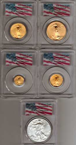The coins are as we know all Gem Uncirculated 2001 $50,$25,$10,$5 gold eagle and then the $1 silver eagle.