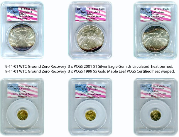 6. WTC PCGS Ground Zero World Trade Center Recovery 9-11-2001 1999 PCGS Certified $5 Gold Maple Leaf heat warped and damaged.