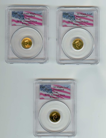 What do you guy thing about this coin, that was send to me by a WTC coin collector today, the coin in question is the $5 Gold Maple from Canada with "PCGS CERTIFIED" written on the flag and not the regular "Gem Uncirculated" there is one coin on E-Bay right now where the sell states that its an "WTC PCGS Error coin". It maybe, but I have no information about PCGS making this mistake on some of the coins. The WTC collector that send me the 3 coins pictured wrote me that she had personally seen 3 of these coins on E-Bay at different times. So if it is a true PCGS Error on the printing on the Flag then we know that 3 coin if not more are out there.