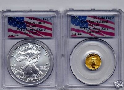 This is the 1 of 1440 set of the WTC series, the set consist of these two coins the 2001 $1 Silver Eagle and the 2001 $5 Gold Eagle both certified as Gem Uncirculated. They will be hard to find but I guess that is what makes collecting so rewarding if it was easy nobody would do it.