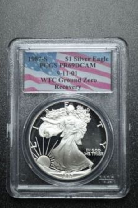 Silver $1 Silver 1987 -S PR69DCAM (Proof 69) (Deep Cameo) beautiful coin with still the mint Proof mirror finish on it, a WTC coin I never knew existed from the WTC vault. This is one of 3 proof coins I will show you in the next few days from the WTC vault. Please anybody else that want to show me coins from the WTC that are rare and not on these pages please send them in to me.