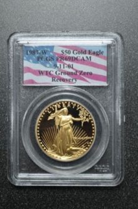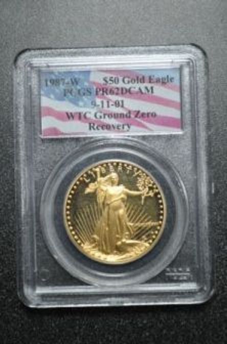 Again from the same friend here is another PCGS Proof coin making it out of the World Trade Center Vault. This coin is the 1987 $50 gold 1 oz coin certified as PR62DCAM, with beautiful luster and mirror finish. A note from my friend says that there is only 1 coin in existence of the Pr62DCAM certified PCGS WTC recovery.
